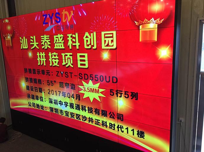 此次泰盛科技為了更好的展示公司以及園區信息,進過考察與深圳中宇視通科技有限公司攜手合作成功打造了一個5行5列55寸3.5mm拼縫拼接大屏。