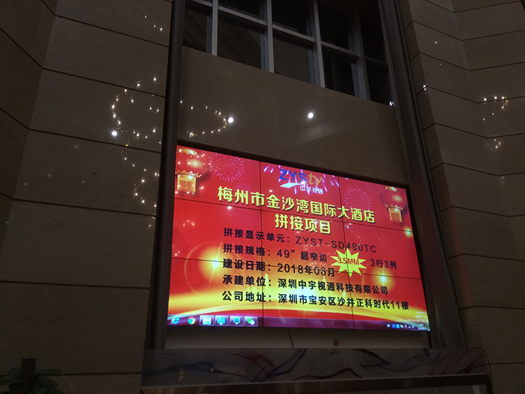 梅州市金沙灣國際大酒店選用中宇視通科技49寸3.5mm拼縫液晶拼接屏,項目安裝調試完成并且順利通過驗收。