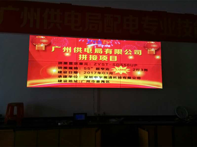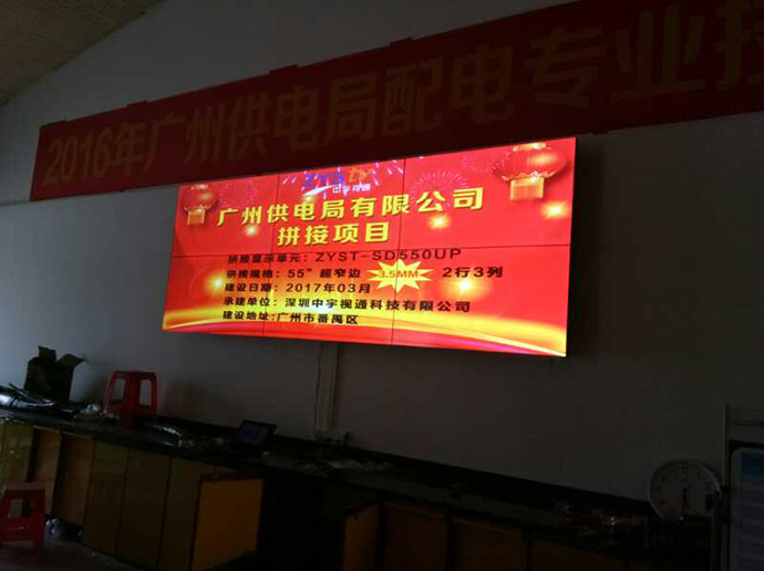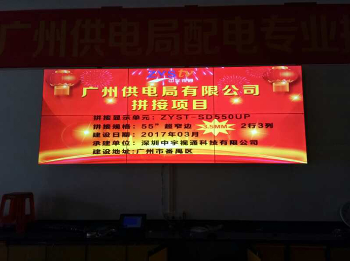 拼接項目:廣州市供電局拼接單元:ZYST-SD550UP拼接拼縫:3.5mm拼接規格:2*3拼接尺寸:55寸拼接屏安裝方式:壁掛承建地址:廣州市番禺區供電局承建日期:2017年3月承建單位:深圳中宇視通科技有限公司