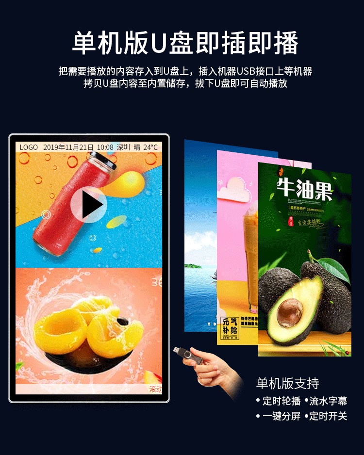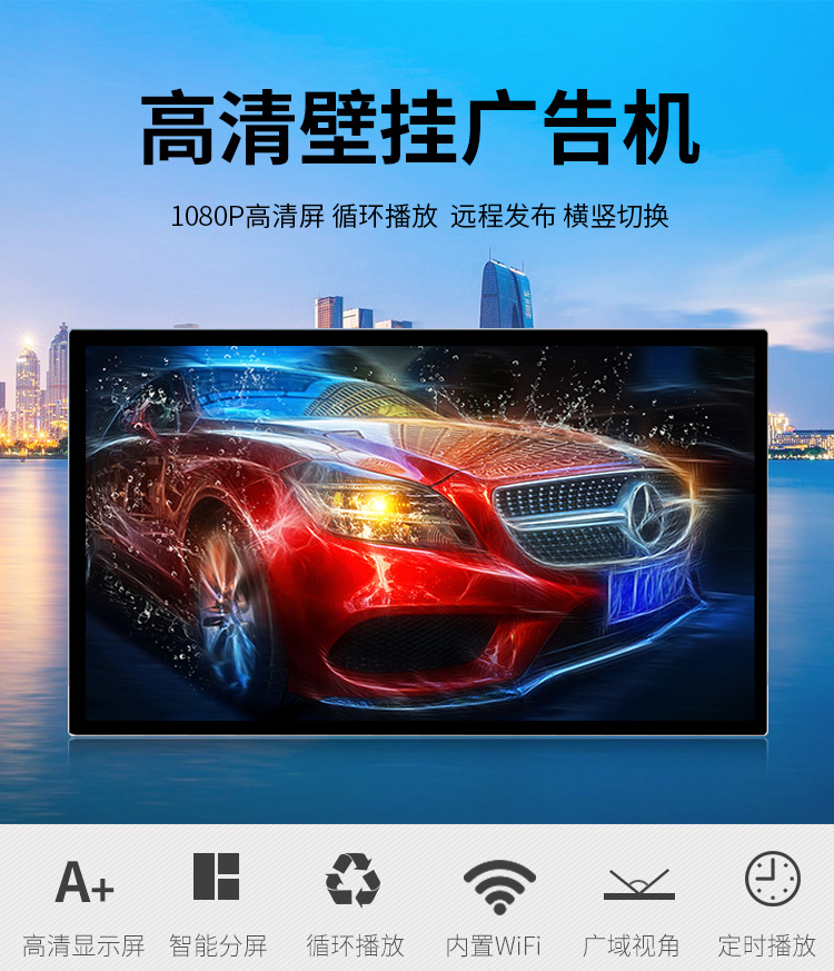 21.5寸壁掛廣告機采用專業級工業液晶屏,視頻圖像展現清晰、自然,能夠更好的表現廣告細節;機身設計外觀時尚、大方,超薄,使用方便、美觀,采用全新環保技術,穩定性好,能夠適應并在惡劣環境中正常工作。正常使用情況下,可達60000小時以上的超長的使用壽命,并且能夠7*24小時不間斷工作。目前,液晶廣告機憑借優良的顯示性能,已經成為人們認同的理想的“第五大媒體”顯示設備。