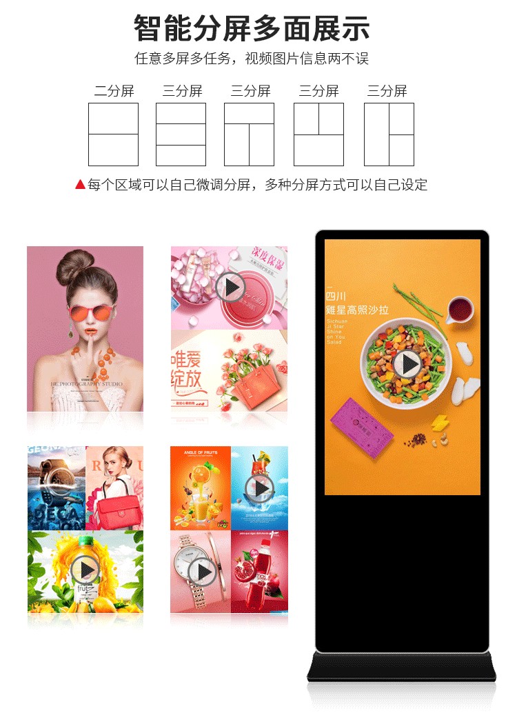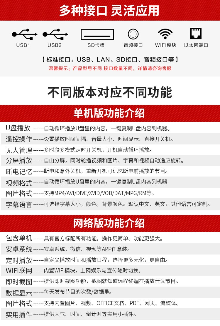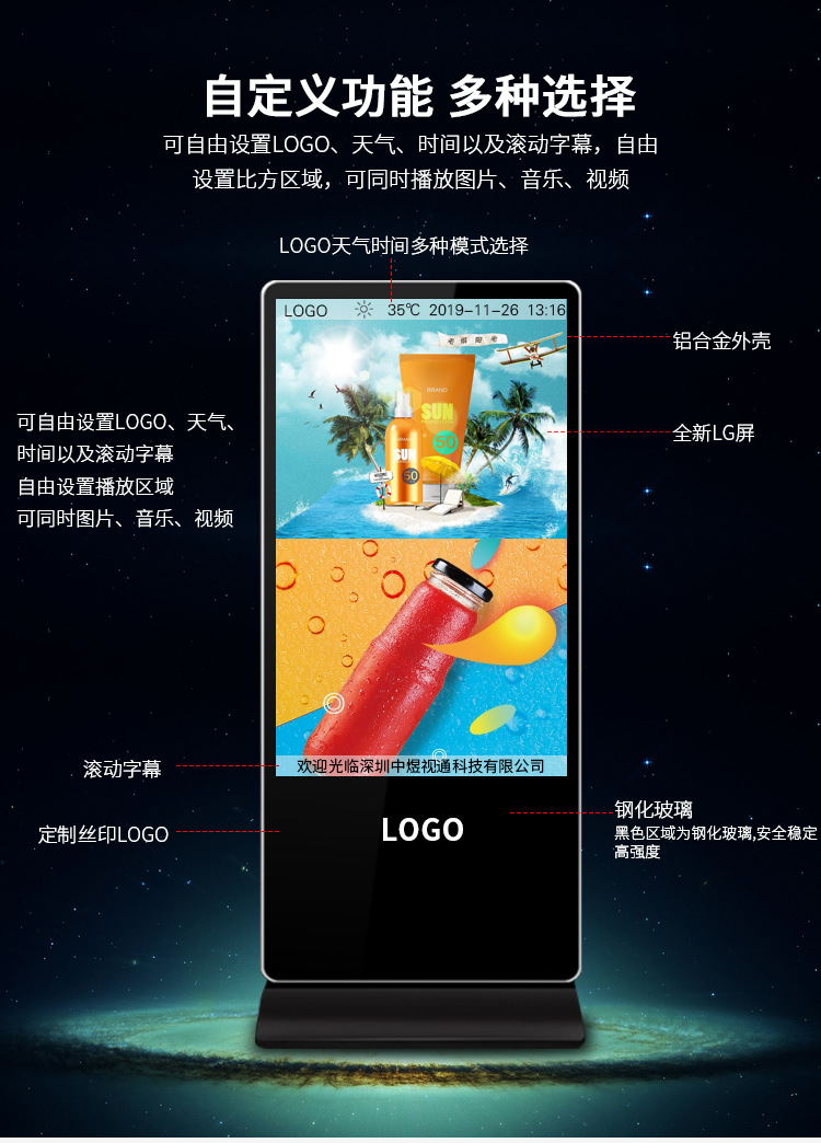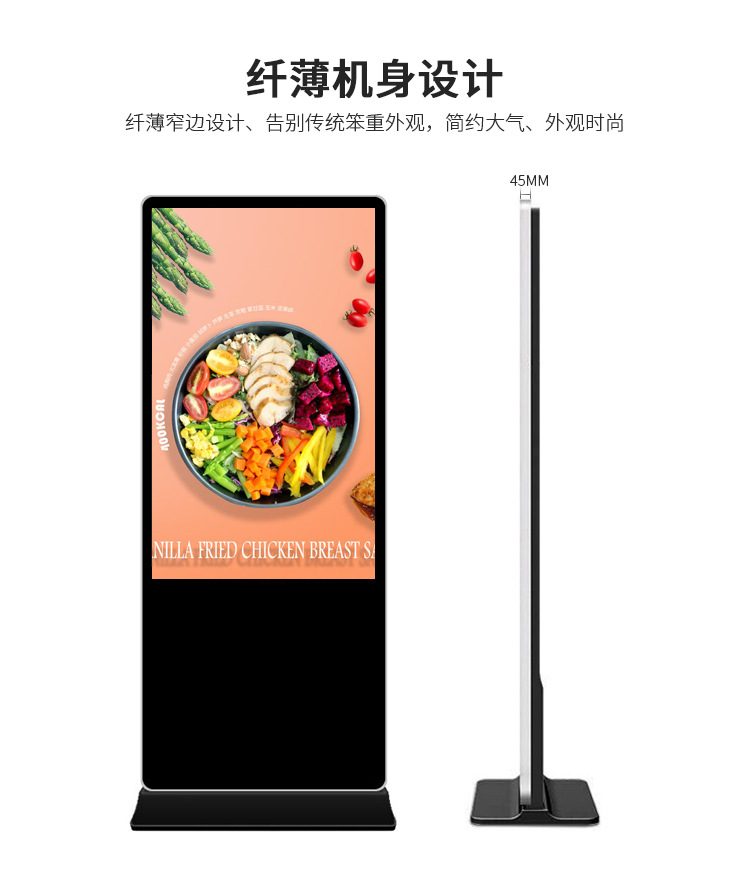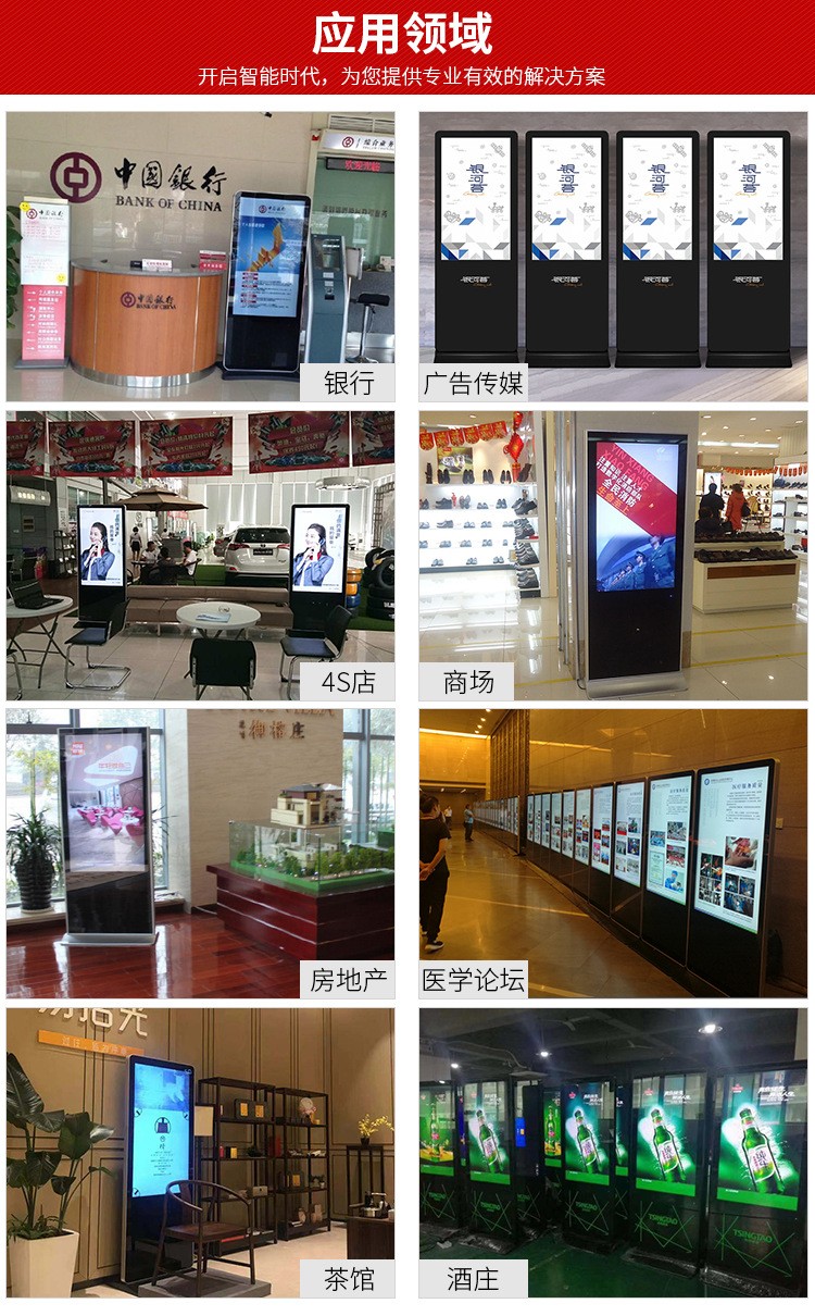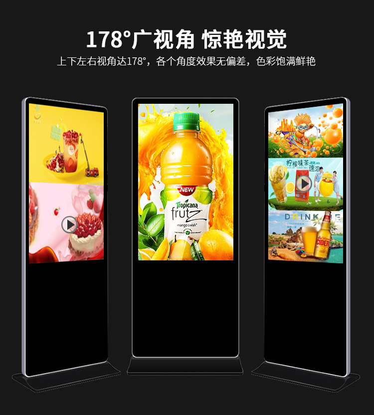49寸立式液晶廣告機系列產品屬于壁掛、落地式數字標牌廣告機,外觀優美,全身五金冷軋鋼板噴涂,邊條鋁合金型材,面板4MM專用鋼化玻璃,橫式16:9液晶屏,高清效果。內屏采用三星、LG原裝工業級液晶屏,配以最先進的密集型LCD光源背光系統,背光色彩還原度好,超高對比度,強光下依然清晰無比。特別適合高端品牌的綜合多媒體技術,向消費者傳遞全方位的產品信息,促銷信息等。提升產品在銷售終端的顯現率和陳列效果,刺激沖動性購買。相比于其他傳統媒體和促銷方式,投入極低廉,性價比極高。
